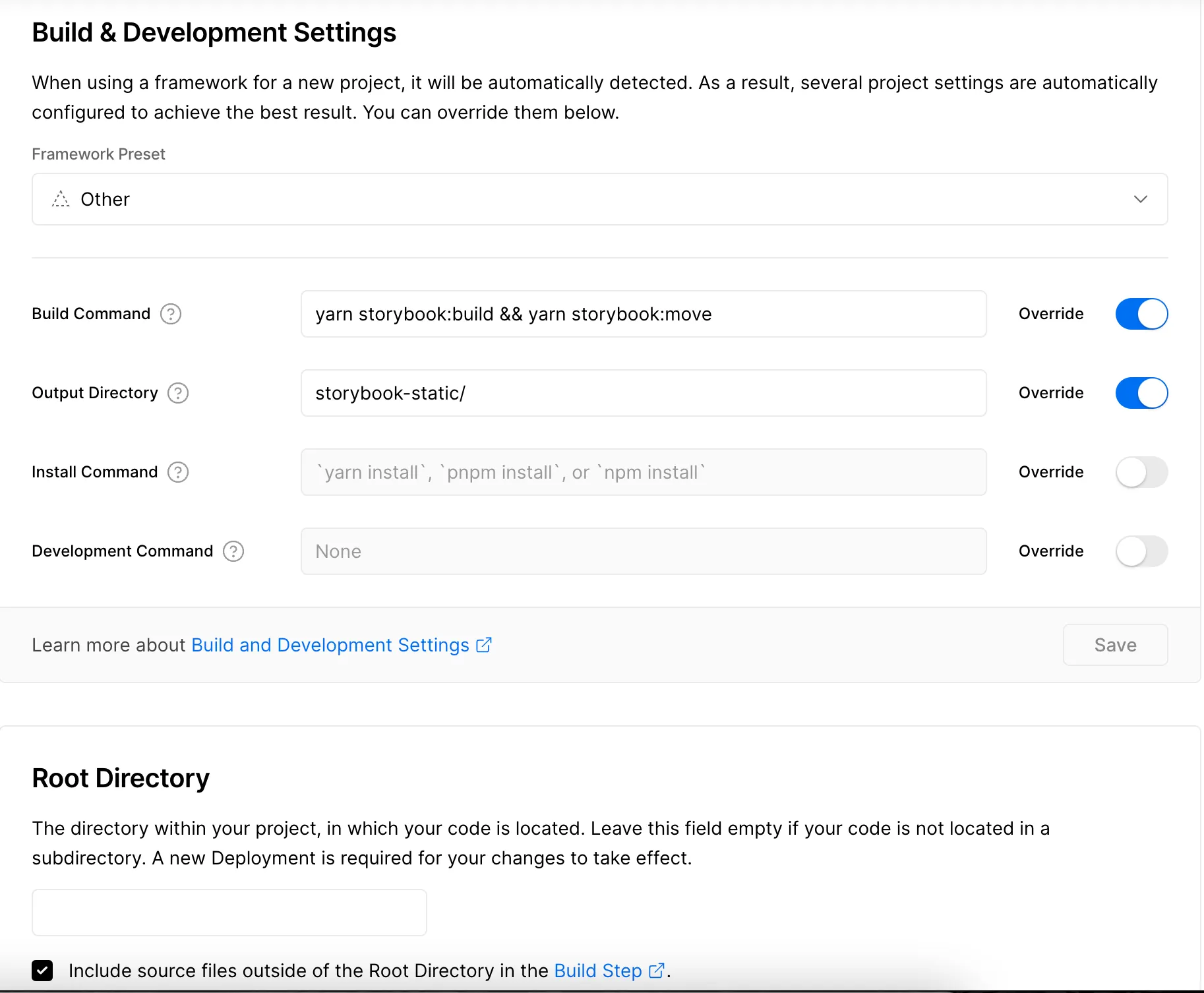 The yarn storybook:build && yarn storybook:move command will build our Storybooks as seen earlier, and then move the generated statics to the appropriate directory (output directory).